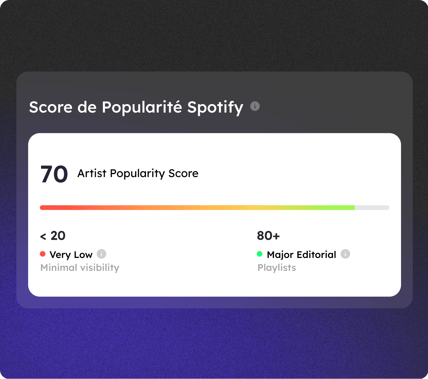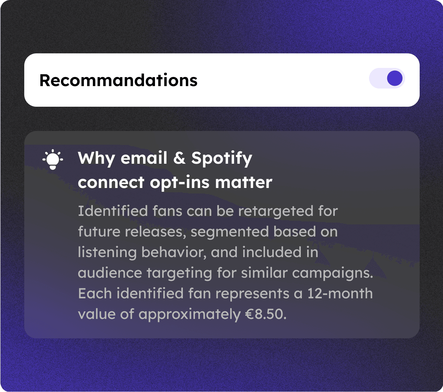 Our algorithms help you identify the platforms where your music has the most potential, adjust targeting and maximize your conversion rate and your Spotify visibility score