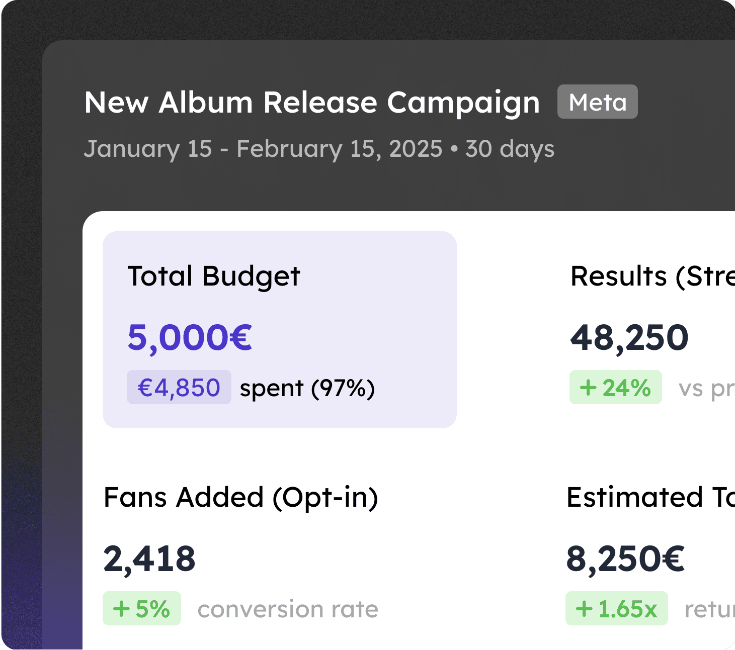 Tracking your campaign's performance is simple with Base For Music. We provide real-time reporting that is accessible directly from your dashboard and shared regularly by email throughout the campaign. This includes key metrics like engagement, new followers, and reach, giving you a complete view of your campaign's progress at all times.